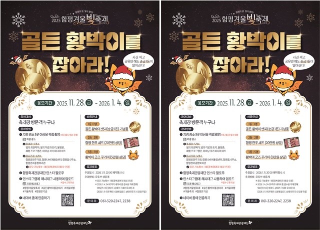 [위키트리 광주전남취재본부 노해섭 기자]올겨울, 전남 함평의 밤하늘을 화려하게 수놓을 ‘2025 함평 겨울빛축제’가, ‘순금 한 돈’이라는 역대급 경품을 내걸고 관광객들의 마음을 훔칠 채비를 마쳤다. 함평축제관광재단은 축제 기간 동안, 축제장과 함평 읍내 곳곳에 숨겨진 ‘황박이’를 찾아 인스타그램에 인증하면, 추첨을 통해 ‘순금 황금박쥐 뱃지’를 증정하는 SNS 이벤트 ‘골든 황박이를 잡아라!’를 진행한다고 밝혔다.
