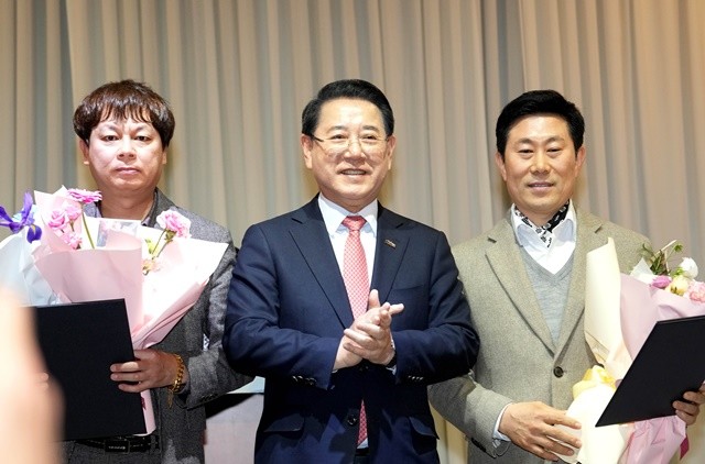 김영록 전라남도지사가 28일 순천 에코그라드호텔에서 열린 2025 재순천광양향우인의 밤 및 회장 이·취임식 행사에서 고향사랑실천 유공자에게 표창을 수여하고 기념촬영을 하고 있다.