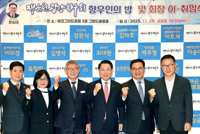 김영록 전라남도지사가 28일 순천 에코그라드호텔에서 열린 2025 재순천광양향우인의 밤 및 회장 이·취임식 행사에서 김태호 신임 회장등 임원진들과 기념촬영을 하고 있다.
