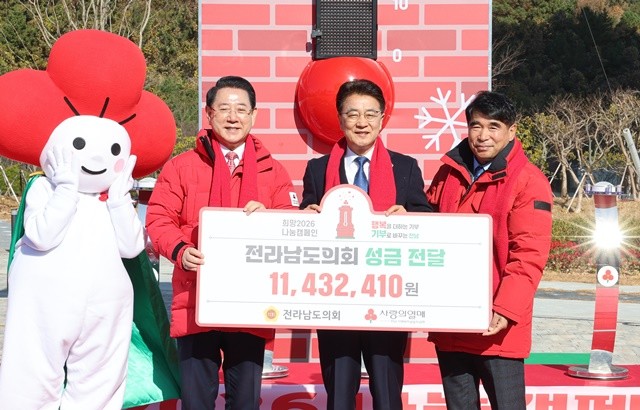 전라남도의회(의장 김태균)는 1일, ‘희망 2026 나눔 캠페인’ 출범식에서 전국 지방의회 최초로 도입한 상시 ESG 기부 프로그램을 통해 모은 성금 1,140만 원을 사회복지공동모금회에 전달하며, 나눔의 계절 12월의 문을 활짝 열었다.