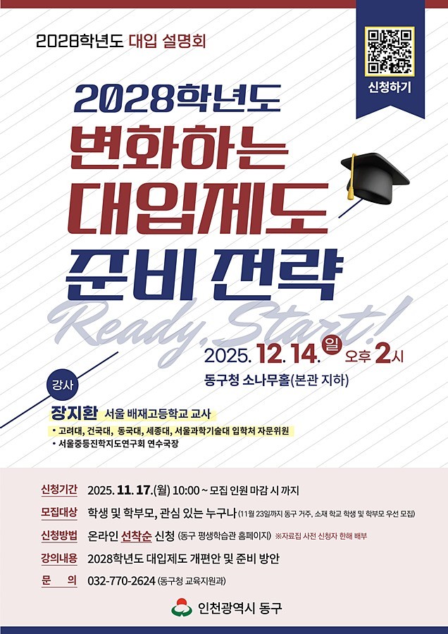 인천 동구(구청장 김찬진)는 오는 14일 구청 소나무홀에서 변화하는 교육과정과 입시 제도로 혼란을 겪는 학생·학부모를 위해 ‘2028학년도 대입제도 및 준비 전략’ 설명회를 개최한다고 밝혔다.