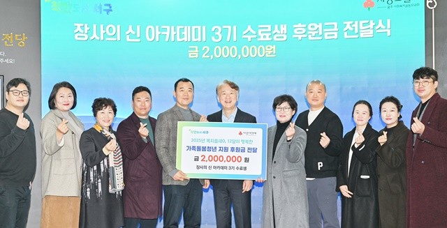 [위키트리 광주전남취재본부 노해섭 기자] 장사의 비법을 배우러 모였던 광주시 서구의 소상공인들이, 이제는 이웃을 돕는 ‘나눔의 비법’을 실천하며 지역 사회에 따뜻한 감동을 선사하고 있다. 서구의 골목상권 리더 양성 과정인 ‘장사의 신 아카데미’ 3기 수료생들이, 자신보다 더 어려운 처지에 놓인 ‘가족돌봄청년’들을 위해 십시일반 모은 후원금 200만 원을 기탁했다.