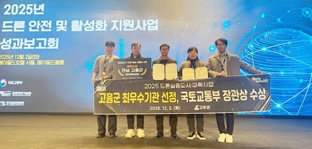 [위키트리 광주전남취재본부 노해섭 기자]고흥군(군수 공영민)은 2일 메이필드호텔 서울에서 열린 ‘2025년 드론 안전 및 활성화 지원 성과보고회’에서 드론실증도시 구축사업 최우수 지자체로 선정돼 국토교통부 장관상을 수상했다고 밝혔다.