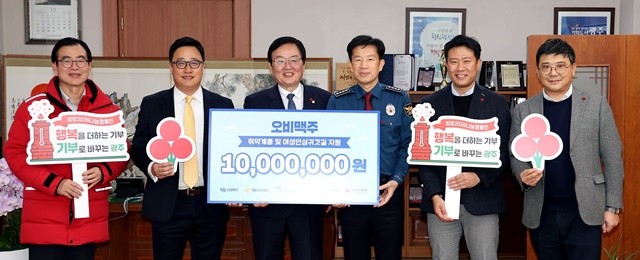 [위키트리 광주전남취재본부 노해섭 기자]광주시 북구(청장 문인)는 3일 청장실에서 김용관(오른쪽 세번째) 북부경찰서장, 구자범(왼쪽 두번째) 오비맥주 부사장 등 관계자들이 참석한 가운데 오비맥주(대표 배하준)로부터 지역 취약계층 및 여성안심귀갓길 지원을 위한 사랑의 후원금 1000만원을 기탁 받았다.