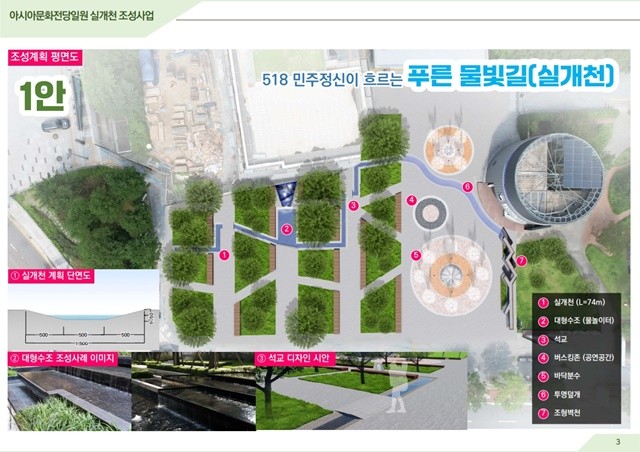 ‘아시아문화전당 실개천 조성’은 아시아문화전당 회화나무 공원 주변에 도심 물길을 조성해 아시아문화전당과 구도심 활성화를 도모하는 사업이다. 광주시는 2025년부터 2026년까지 총 30억원(국비 15억원·시비 15억원)을 투입해 사업을 추진한다.