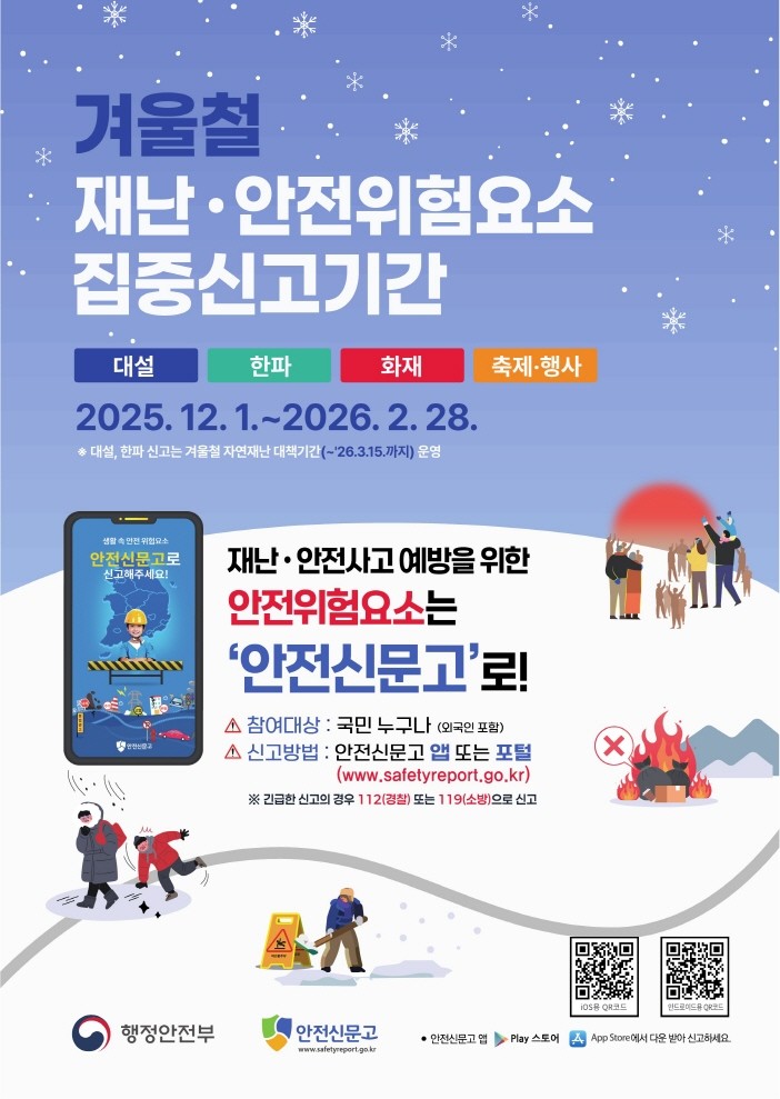 이번 기간에는 겨울철에 발생 가능성이 높은 ▲대설 ▲ 한파 ▲화재 ▲축제·행사 등 4가지 유형의 위험 요소를 대상으로 시민이 직접 신고할 수 있다.