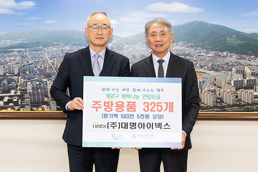인천 계양구(구청장 윤환) 경영자협의회와 ㈜대명아이넥스(대표 김국환)는 12월 3일, 계양구 취약계층 지원을 위해 이웃돕기 성금 15,708,000원과 주방용품 325개(환가액 583만 5천 원 상당)를 기탁했다.