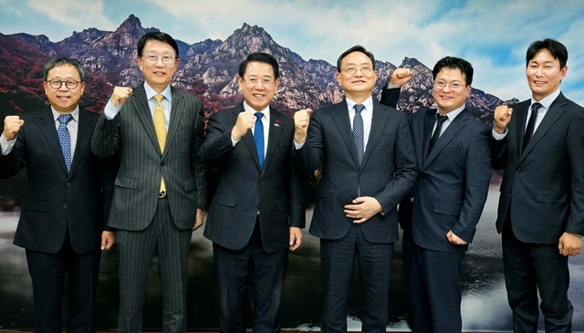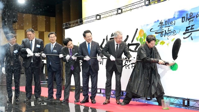김영록 전남도지사가 4일 여수 호텔JCS여수에서 열린 전남농협 농심천심(農心天心) 공감 포럼 행사에서 주요 내빈들과 퍼포먼스를 하고 있다.