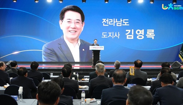 김영록 전남도지사가 4일 여수 호텔JCS여수에서 열린 전남농협 농심천심(農心天心) 공감 포럼 행사에서 인사말을 하고 있다.