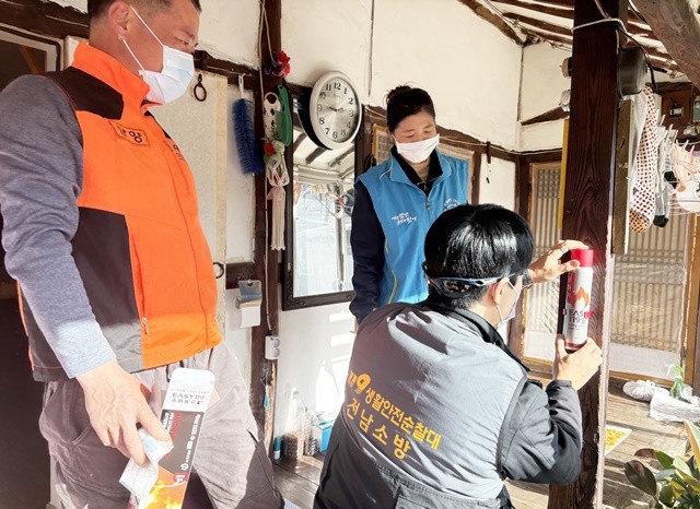 대전면 복지기동대와 소방대원, 의용소방대는 가구별로 화재예방 조치와 일상생활 안전 교육을 함께 제공했고, 연기감지기, 소화기, 화재대피 마스크, 미끄럼방지 매트 등으로 구성된 안전 꾸러미를 전달했다.