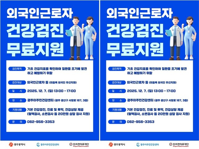 [위키트리 광주전남취재본부 노해섭 기자]광주광역시(시장 강기정)는 오는 7일 오후 1시부터 5시까지 광주이주민건강센터에서 외국인근로자 등을 대상으로 무료 건강검진을 실시한다.
