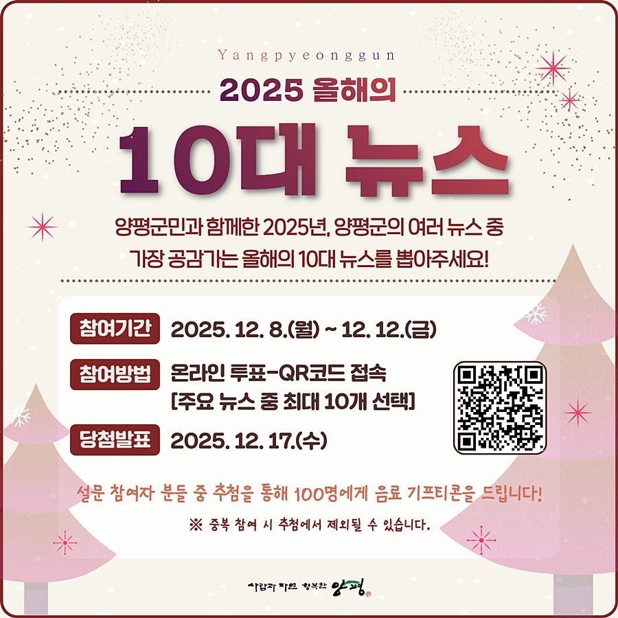 경기 양평군(군수 전진선)은 ‘2025년 양평군 올해의 10대 뉴스’ 선정을 위한 온라인 투표를 오는 8일부터 12일까지 실시한다고 밝혔다.