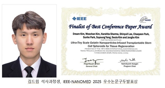 우수논문발표상을 수상한 김드림 석사과정생은 아주 작은 젤라틴 나노입자를 이용해 줄기세포 덩어리(스페로이드)의 치료 능력을 한 단계 끌어올린 차세대 치료제 기술을 발표해, 학계의 비상한 관심을 모았다.