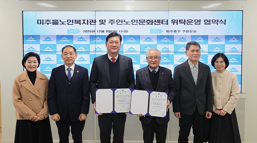 인천 미추홀구(구청장 이영훈)는 지난 9일 구청장실에서 미추홀노인복지관 및 주안노인문화센터의 위탁 운영을 위해 사단법인 대한노인회 인천미추홀구지회(대표 이종원)와 운영 협약을 체결했다.