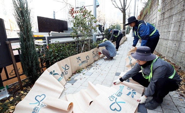 [위키트리 광주전남취재본부 노해섭 기자]10일 광주시 북구 두암동 한 어린이보호구역 인도 경사로에서 북구청 공원녹지과 도시녹화팀 직원들이 겨울철 제설제로 인한 가로화단 피해 방지를 위해 방풍벽을 설치하고 있다.