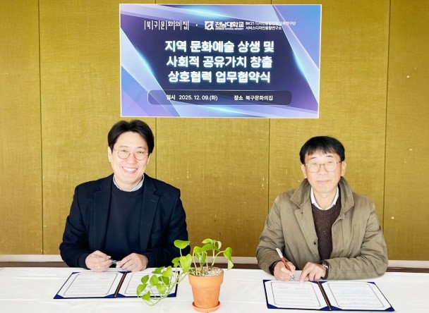 11일 전남대에 따르면, 전남대학교 BK21 휴먼케어 지능형 문화예술콘텐츠의 디자인융합인재양성 교육연구단(아트&디자인테크놀로지 협동과정)과 북구문화의집은 지난 9일 지역 문화예술 상생 및 사회적 공유가치 실현을 위한 업무협약(MOU)을 체결했다.