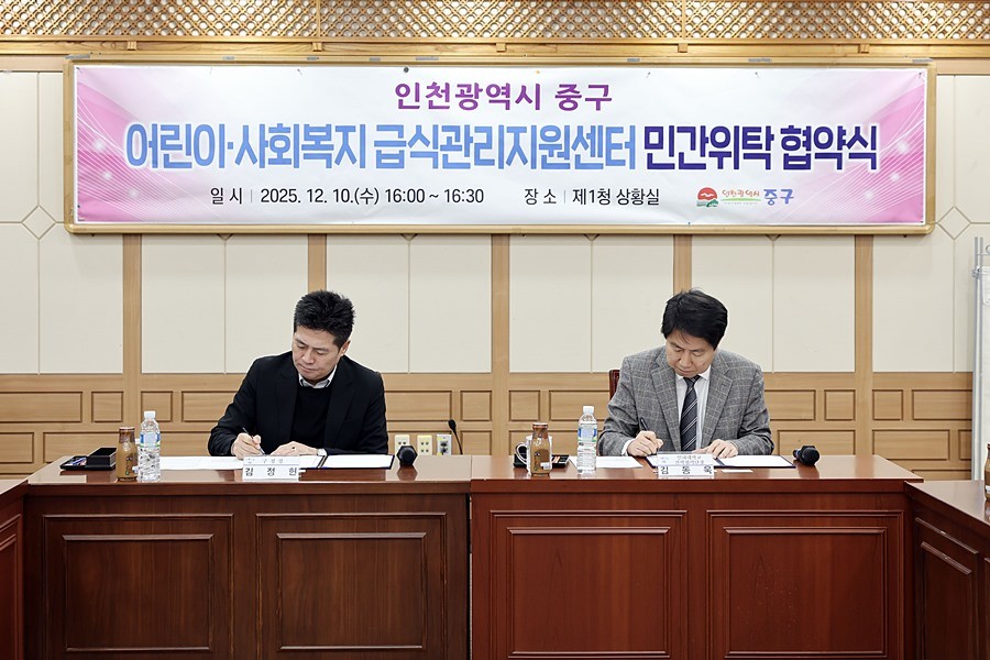 인천시 중구(구청장 김정헌)는 최근 인하대학교 산학협력단과 ‘인천 중구 어린이·사회복지 급식관리지원센터 위탁 운영 협약’을 체결했다고 11일 밝혔다.