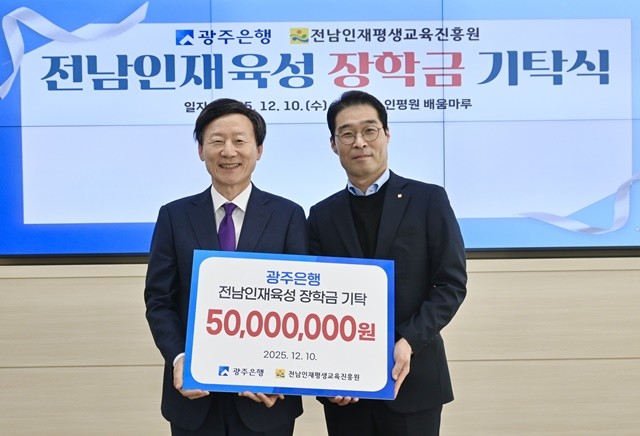 기탁식에는 김종훈 광주은행 부행장, 범희승 전남인재평생교육진흥원장 등이 참석해 장학금을 전달하고 향후 인재육성 협력 방향을 논의했다.