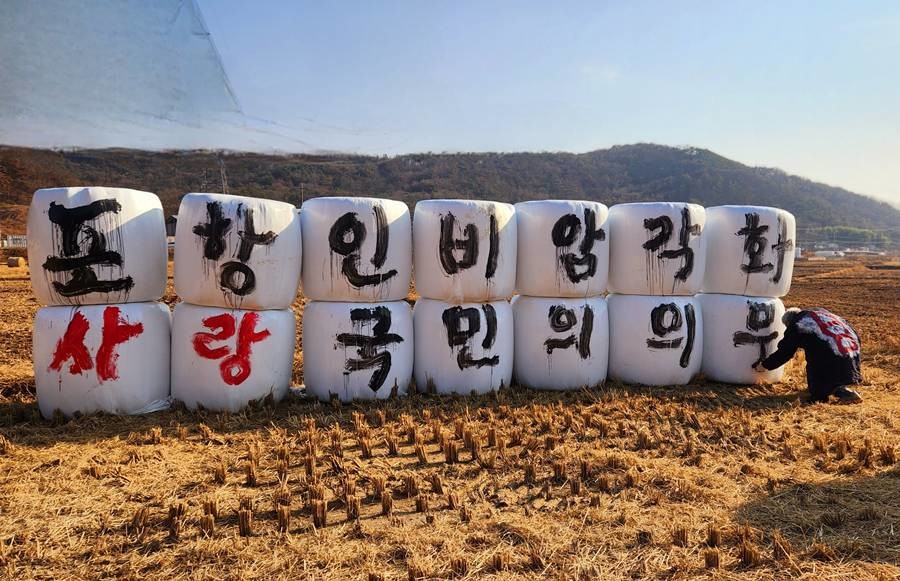 [포항=위키트리]이창형 기자=쌍산 김동욱 서예가는 지난 11일 포항시 기계면 들판에서 '포항 인비리 암각화 사랑, 국민의 의무' 퍼포먼스 행사를 마련했다.