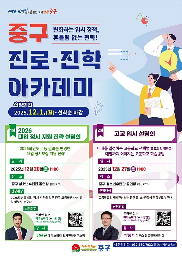 인천시 중구(구청장 김정헌)는 오는 20일 오전 11시 중구청소년수련관(송산로 52)에서 수능을 치른 고등학생(N수생 포함)과 학부모들을 대상으로 ‘2026학년도 대입 정시 지원 전략 설명회’를 개최한다고 밝혔다.