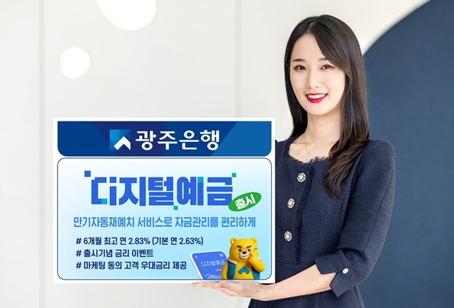 [위키트리 광주전남취재본부 노해섭 기자] 광주은행(은행장 고병일)은 계약기간과 가입금액을 자유롭게 설정할 수 있고, ‘만기자동재예치 서비스’를 통해 자금관리를 한층 편리하게 지원하는 비대면 전용 예금상품 ‘디지털예금’을 출시했다고 11일 밝혔다.