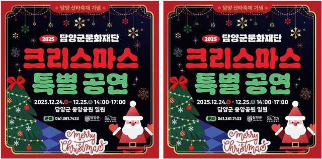 [위키트리 광주전남취재본부 노해섭 기자] 담양군문화재단(이사장 정철원)은 연말연시를 맞아 ‘제7회 담양산타축제’와 연계한 ‘2025 크리스마스 특별 공연’을 12월 24일부터 25일까지 이틀간 담양읍 중앙공원 일원에서 개최한다.