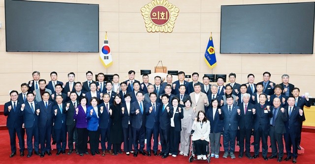 [위키트리 광주전남취재본부 노해섭 기자]김영록 전라남도지사가 16일 전남도의회에서 열린 ‘2025년 도의원 초청 송년 간담회’에 참석해 김태균 전남도의회 의장, 김대중 전남도교육감 등 도의회 의원들과 기념촬영을 하고 있다.
