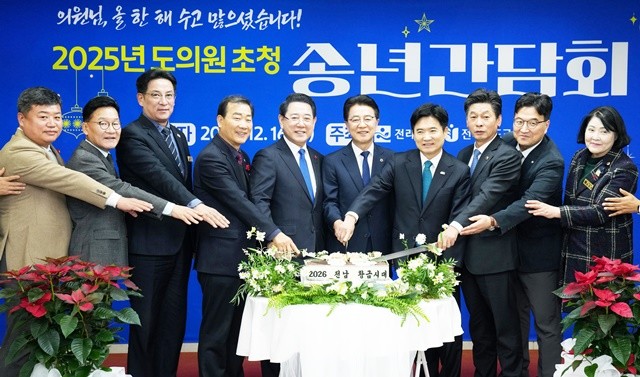 김영록 전라남도지사가 16일 전남도의회에서 열린 ‘2025년 도의원 초청 송년 간담회’에 참석해 김태균 전남도의회 의장, 김대중 전남도교육감 등 도의회 의원들과 떡 케이크 커팅을 하고 있다.