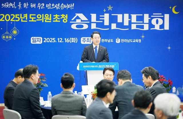 김영록 전라남도지사가 16일 전남도의회에서 열린 ‘2025년 도의원 초청 송년 간담회’에 참석해 인사말을 하고 있다.