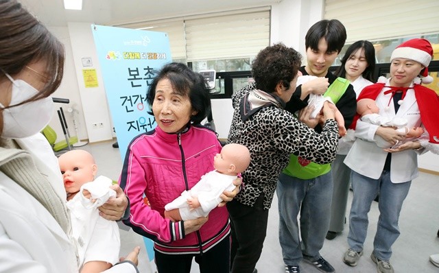 [위키트리 광주전남취재본부 노해섭 기자]16일 광주시 북구 본촌동 본촌건강생활지원센터에서 열린 저출산 극복과 임산부 보호 홍보 캠페인에 참가한 어르신들과 주민들이 임신조끼를 입고 아이 안는 법을 체험해 보고 있다. 최근 올해 1월부터 현재까지 지난해 같은 기간에 비해 임신·출산·진료비 등 지원 건수가 증가한 것으로 집계됐다.