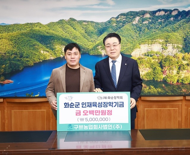 [위키트리 광주전남취재본부 노해섭 기자]화순군(군수 구복규)은 지난 12일 구쁘농업회사법인(대표 오성주)이 지역 인재 육성과 학생들의 학업 지원을 위해 장학금 500만 원을 화순장학회에 기부했다고 밝혔다.