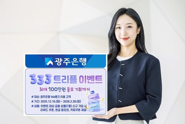 [위키트리 광주전남취재본부 노해섭 기자]광주은행(은행장 고병일)은 2025년 12월 16일부터 2026년 2월 28일까지 광주은행 Wa뱅크 이용 고객을 대상으로 ‘333 트리플 이벤트’를 진행한다고 밝혔다.