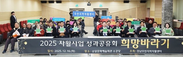 [위키트리 광주전남취재본부 노해섭 기자]전남 무안군(군수 김산)은 무안지역자활센터(센터장 한미정) 2025년 성과공유회를 지난 12월 16일 승달문예회관 소강당에서 개최했으며, 이날 무안지역자활센터 종사자, 자활근로사업 참여자, 지역주민 등 100여 명이 모여 소통의 장을 열었다.