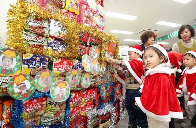 [위키트리 광주전남취재본부 노해섭 기자]17일 광주 북구 양산동 행정복지센터 민원실에서 열린 ‘따순마을! 희망을 이야기하다!’ 공공어린이집 후원물품 기탁식에서 영무예다음, 양산호반, 동그라미, 송촌 어린이집 아이들과 선생님들이 어린이집 학부모들이 후원한 라면을 이용해 라면 트리를 만들고 있다.