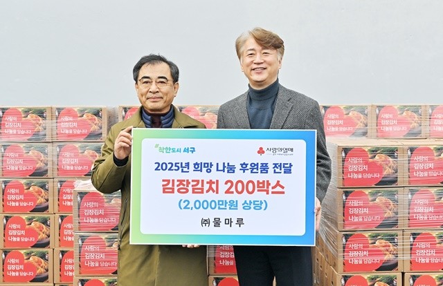 [위키트리 광주전남취재본부 노해섭 기자]광주시 서구(구청장 김이강)는 20일 나주시 물소리삼나라(주)에서 ㈜물마루(대표이사 정상규)로부터 관내 돌봄이웃을 위한 직접 담근 사랑의 김장김치 9kg 200박스(2000만원 상당)을 후원 받았다. 광주 서구 제공