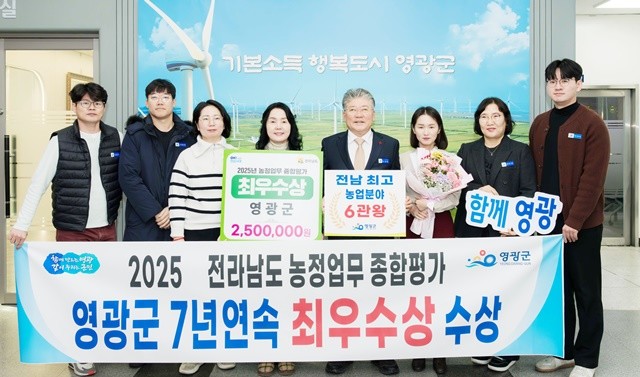 [위키트리 광주전남취재본부 노해섭 기자]영광군은 전라남도 2025년 농정업무 종합평가에서 7년 연속 최우수상을 수상하며, 농정 전반에서의 균형 있는 성과로 도내 최고 수준의 농정 역량을 다시 한번 입증했다.