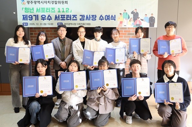 [위키트리 광주전남취재본부 노해섭 기자]광주광역시 자치경찰위원회는 22일 시청 다목적홀에서 ‘제9기 청년 서포터즈112’ 우수 서포터즈에게 감사장을 수여했다.