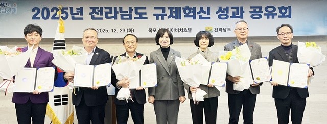 [위키트리 광주전남취재본부 노해섭 기자]전라남도(도지사 김영록)는 23일 목포 샹그리아호텔에서 ‘2025 규제합리화 우수 시군 시상식’을 열고 한 해 규제 개선에 기여한 시군의 성과를 공유했다.