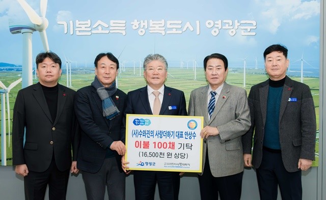 [위키트리 광주전남취재본부 노해섭 기자]영광군은 12월 22일 (사)수와진의 사랑더하기(대표 안상수)에서 영광불갑산상사화축제 기간 중 공연을 통해 모금된 성금으로 구입한 이불 100채(1,650만 원 상당)를 기탁했다고 밝혔다.