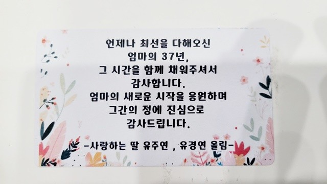 “언제나 최선을 다해오신 엄마의 37년, 그 시간을 함께 채워주셔서 감사합니다. 엄마의 새로운 시작을 응원하며 그간의 정에 진심으로 감사드립니다.”