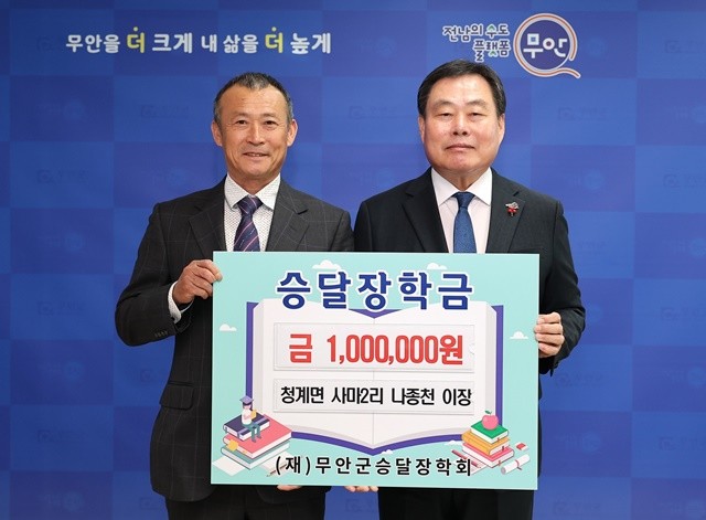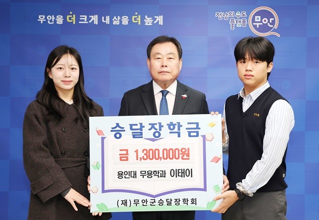 [위키트리 광주전남취재본부 노해섭 기자] 전남 무안군(군수 김산)은 26일 우수 지역인재 육성을 위해 써달라며 용인대학교 무용학과 4학년 이태이 학생이 장학금 130만 원, 청계면 사마2리 나종천 이장이 장학금 100만 원을 각각 (재)무안군승달장학회에 기탁했다고 밝혔다.