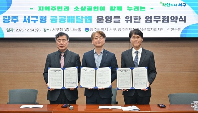서구는 광주경제진흥상생일자리재단(대표이사 신현구), ㈜신한은행 땡겨요 사업단(대표 전성호)과 ‘서구형 공공배달앱 운영을 위한 업무협약’을 체결하고, 온라인 배달 소비 영역까지 골목경제 회복 정책을 확대한다고 밝혔다.