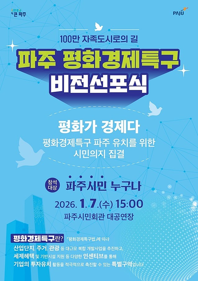 경기 파주시(시장 김경일)는 오는 1월 7일 15시, 파주시민회관 대공연장에서 ‘파주 평화경제특구 비전선포식’을 개최한다고 밝혔다.