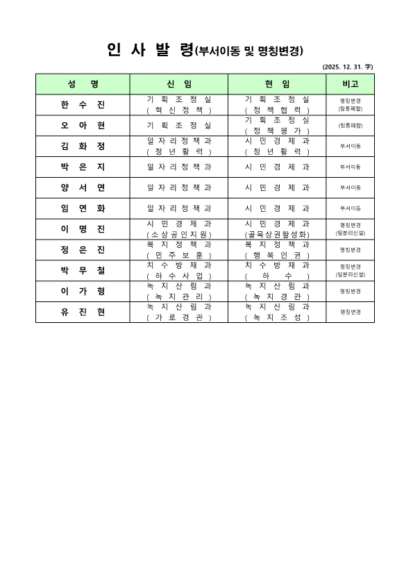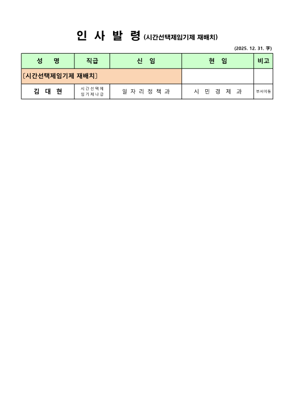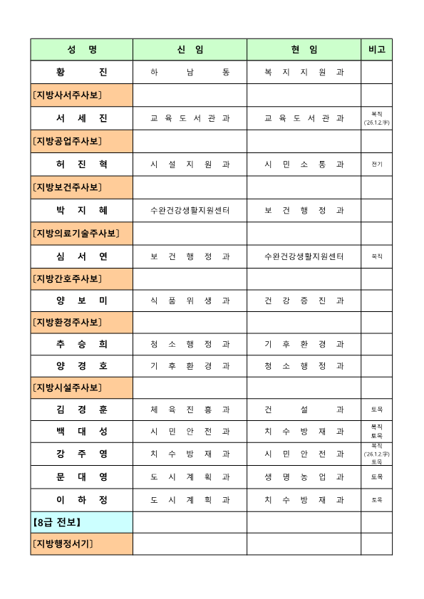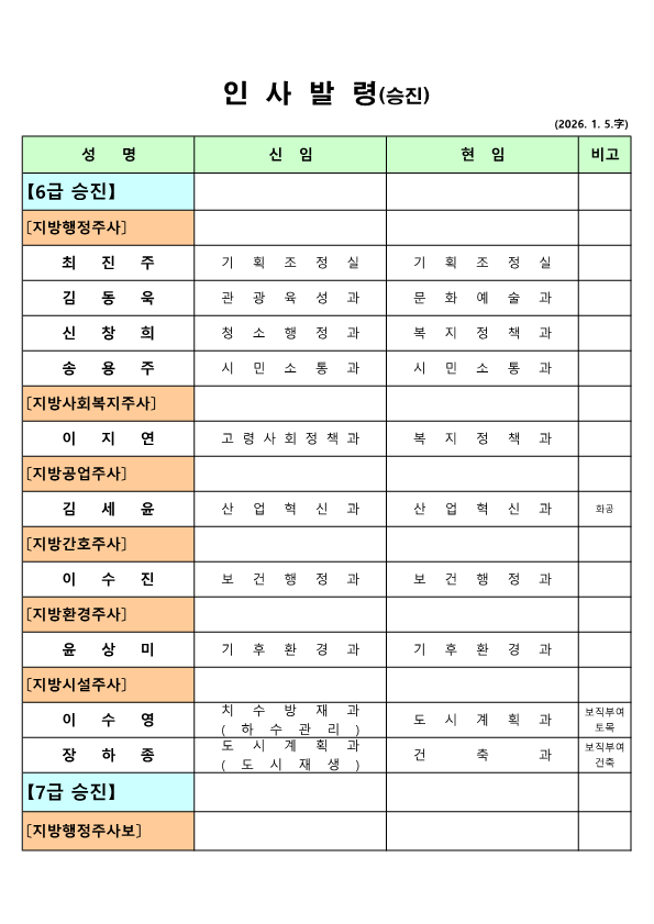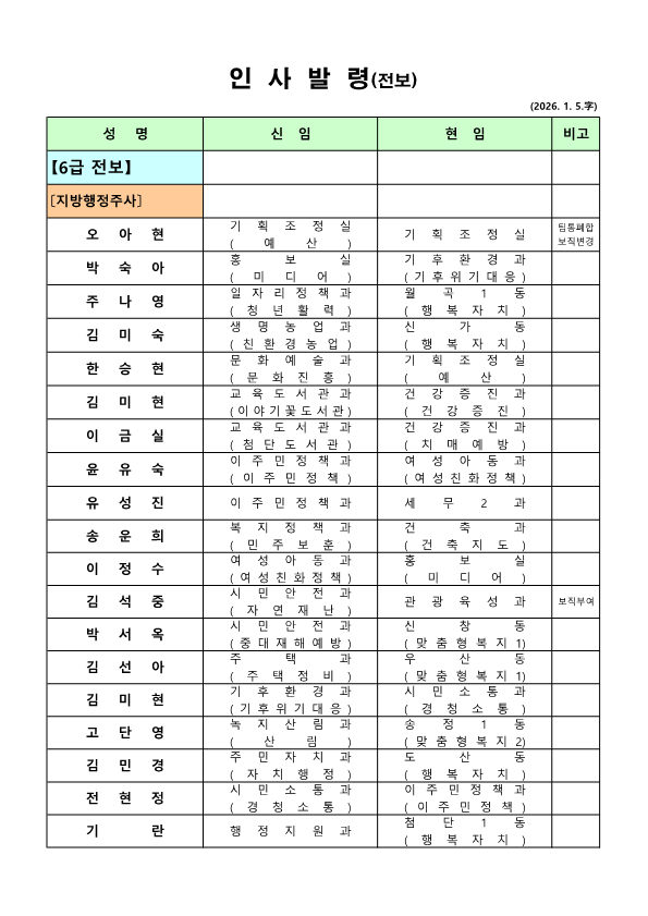 [위키트리 광주전남취재본부 노해섭 기자]광주시 광산구(구청장 박병규)는 2026년 상반기 6급 이하 승진 및 전보 정기인사를 단행했다.