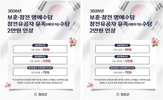 [위키트리 광주전남취재본부 노해섭 기자]화순군(군수 구복규)은 2026년 1월부터 국가보훈대상자와 유족에 대한 예우를 한층 강화하기 위해 보훈 관련 수당을 월 2만 원씩 인상한다고 밝혔다.