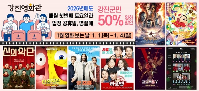 특히 ‘영화 보는 날’은 개관 이후 강진영화관의 대표 프로그램으로 자리 잡으며 군민들로부터 높은 만족도를 얻어 왔으며, 군은 2026년에도 지속적인 프로그램 운영을 통해 지역 간 문화 격차를 완화하고 군민 삶의 질 향상에 기여할 것으로 기대하고 있다.