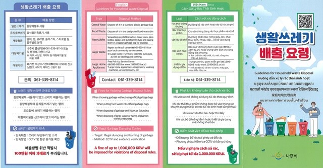 [위키트리 광주전남취재본부 노해섭 기자] 외국인 거주자와 근로자가 생활폐기물 배출 방법을 쉽게 이해하고 올바르게 실천할 수 있도록 나주시가 다국어 홍보물을 제작해 무단투기 예방과 쾌적한 도시환경 조성에 나선다.