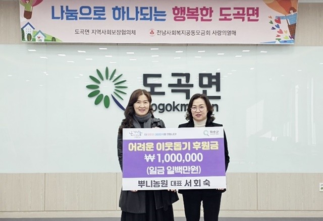 [위키트리 광주전남취재본부 노해섭 기자]화순군 도곡면(면장 김수진)은 지난해 12월 30일 뿌니농원(도곡면 신성리 소재) 서회숙 대표가 지역 내 어려운 이웃을 돕기 위해 성금 100만 원을 도곡면 지역사회보장협의체에 기탁 했다고 밝혔다.