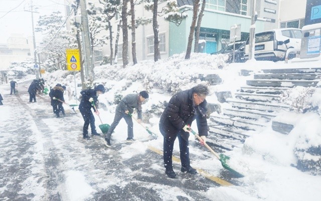 그러나 여전히 많은 눈이 남아 있어, 이날 오전 장세일 군수와 안전관리과를 비롯한 군청 직원들이 다시금 주요 시가지에서 제설 작업을 이어갔다.