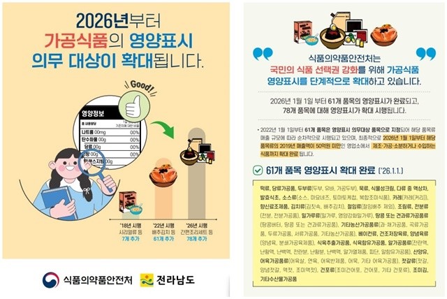 [위키트리 광주전남취재본부 노해섭 기자]전라남도(도지사 김영록)는 국민의 알권리 강화와 건강한 식생활 유도를 위해 일부 품목에만 적용되던 축산물가공품 영양성분 표시제도가 1월부터 전면 확대된다고 밝혔다.